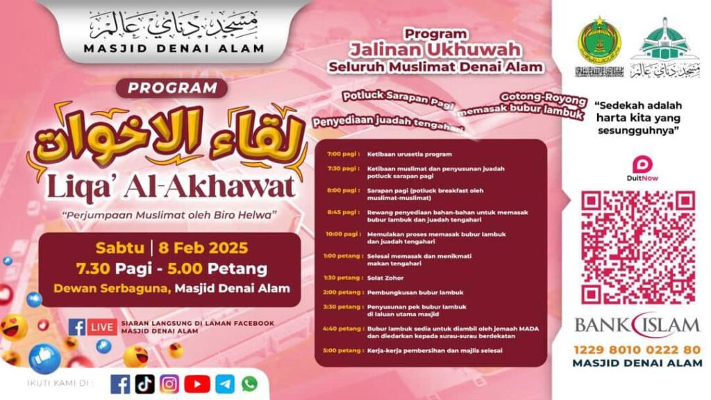 • Program Liqa’ Al-Akhawat •Biro Hal Ehwal Wanita (Helwa) telah mengadakan program jalinan ukhuwah muslimat di Masjid Denai Alam pada hari Sabtu, 8 Feb 2025.Antara aktiviti yang diadakan adalah memasak bubur lambuk untuk diagihkan kepada semua jemaah Masjid Denai Alam.Setinggi-tinggi penghargaan & terima kasih diucapkan kepada semua yang terlibat menjayakan program ini. Butiran Program:Tarikh: 8 […]